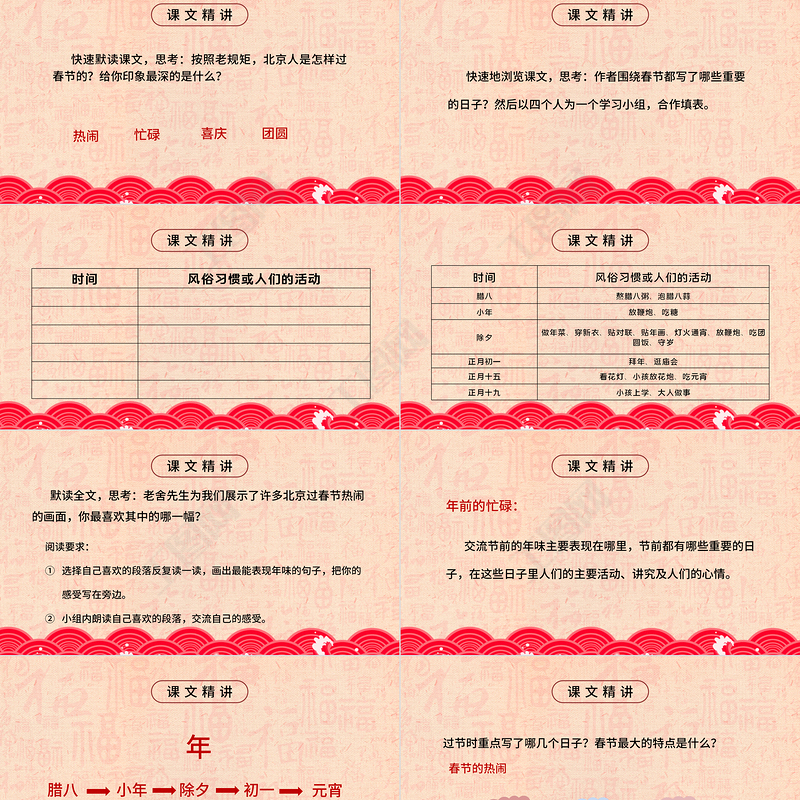 快速默读课文,思考:按照老规矩,北京人是怎样过春节的?给你印象最深的是什么?热闹忙碌喜庆团圆课文精讲