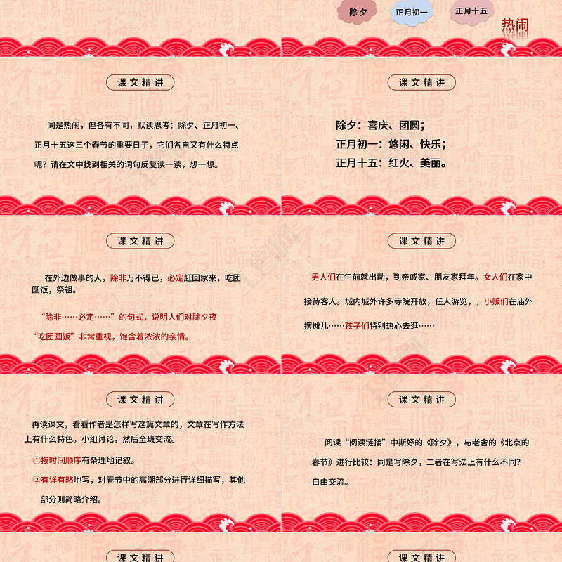 除夕:喜庆、团圆;正月初一:悠闲、快乐;正月十五:红火、美丽。课文精讲